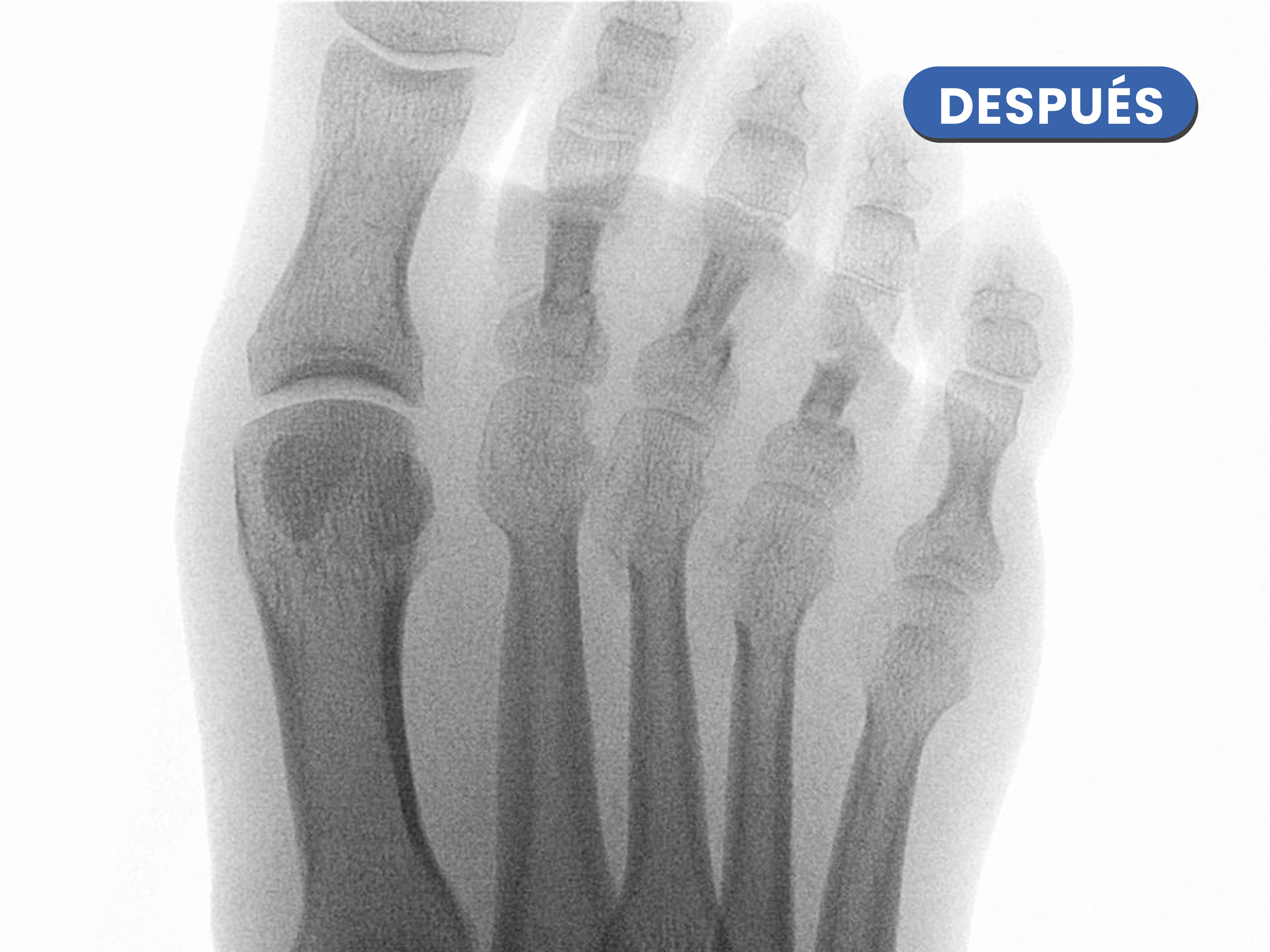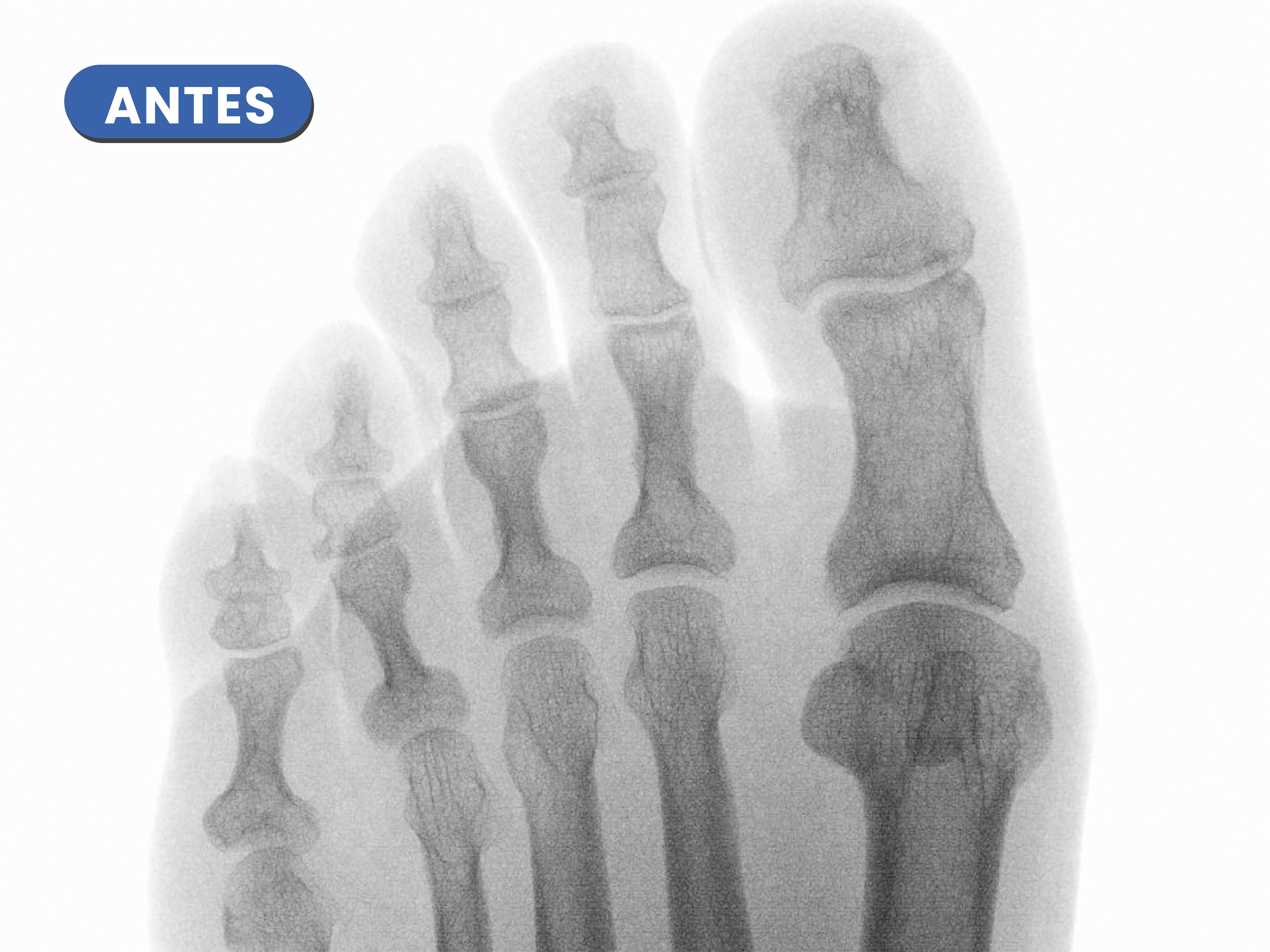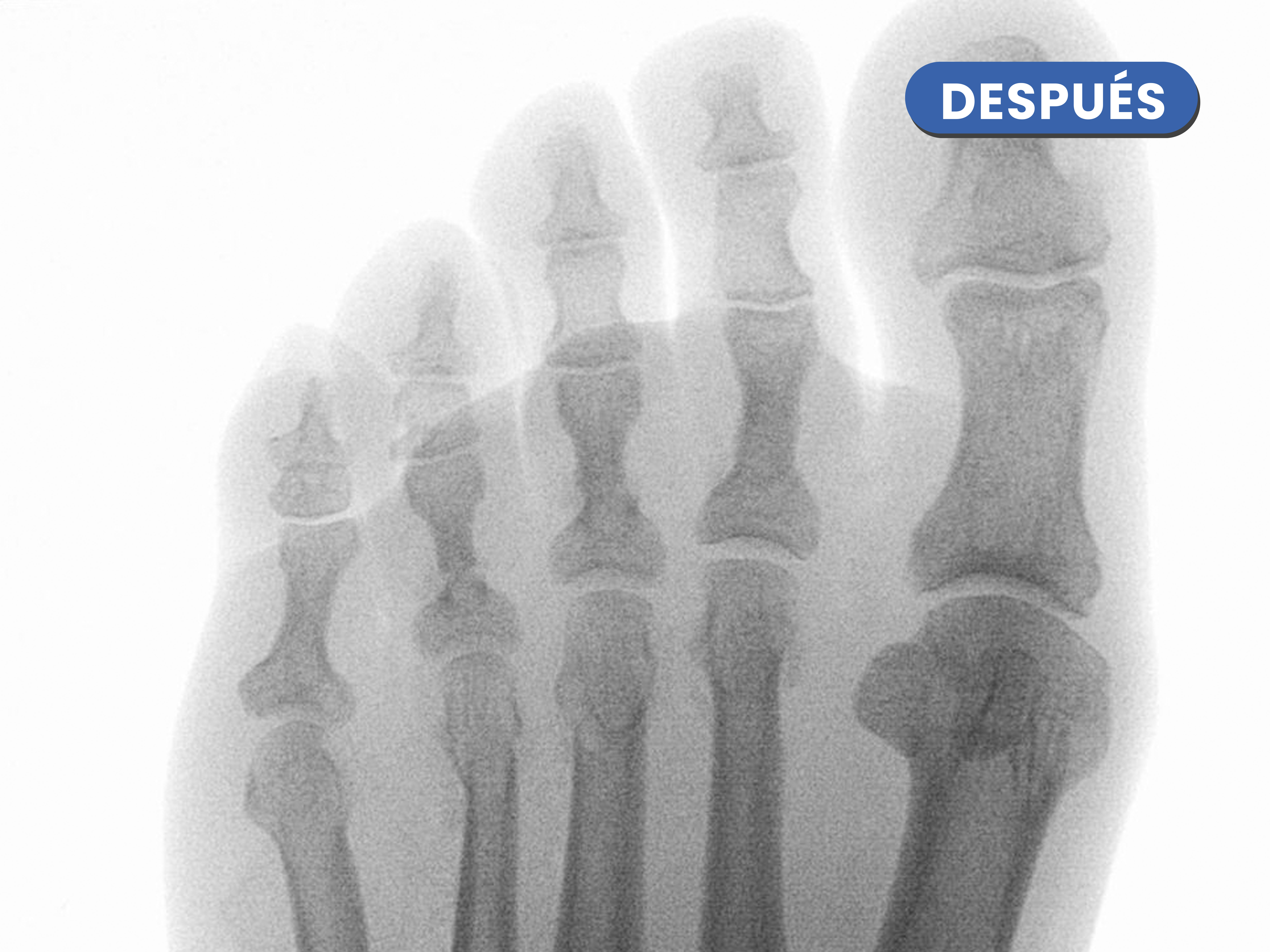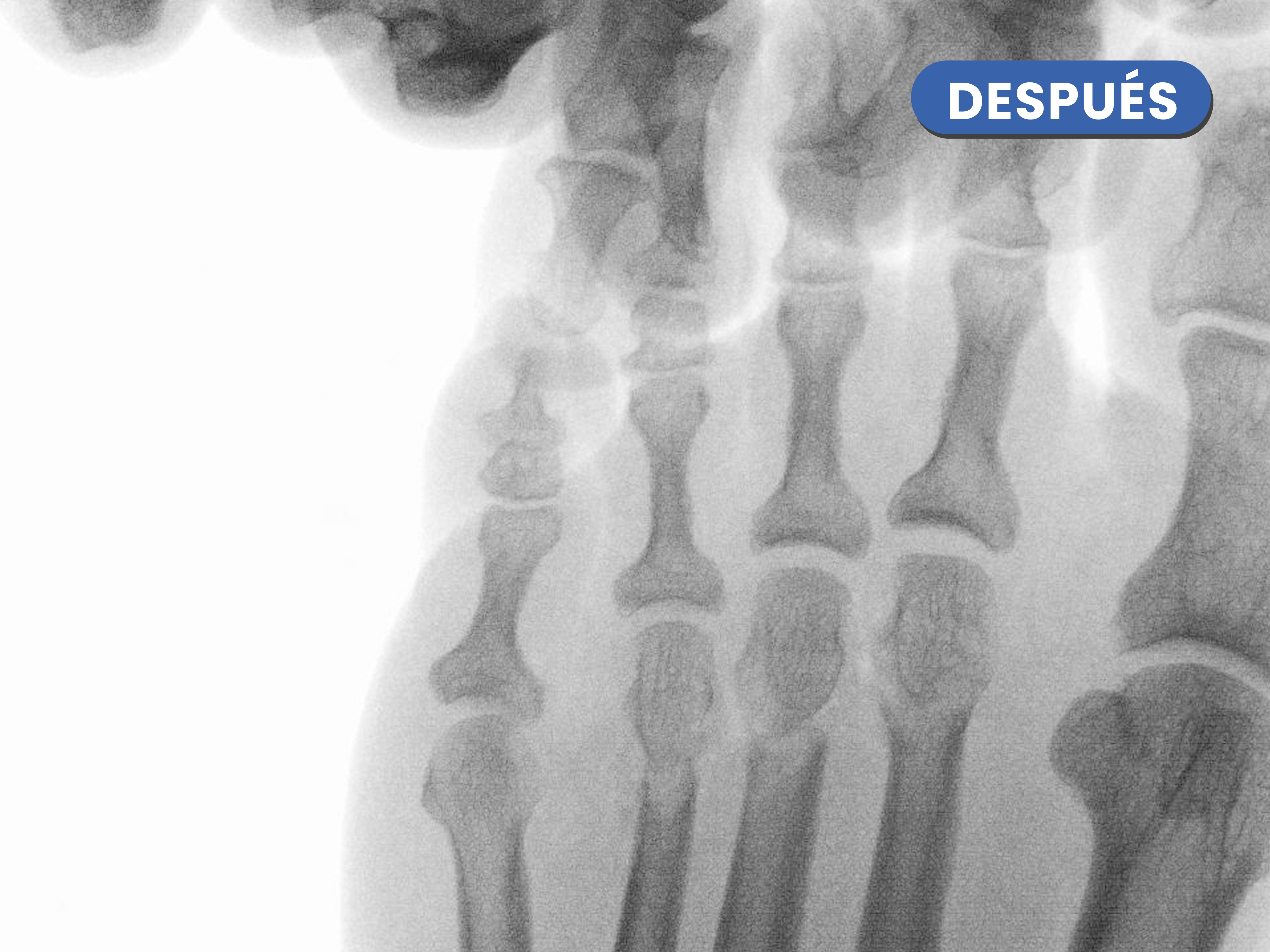 En este caso destaca la corrección metatarsofalángica tras la realización de la osteotomía metatarsal y osteotomía de la falange proximal del cuarto dedo, generandose esa línea o espacio articular entre ambos.