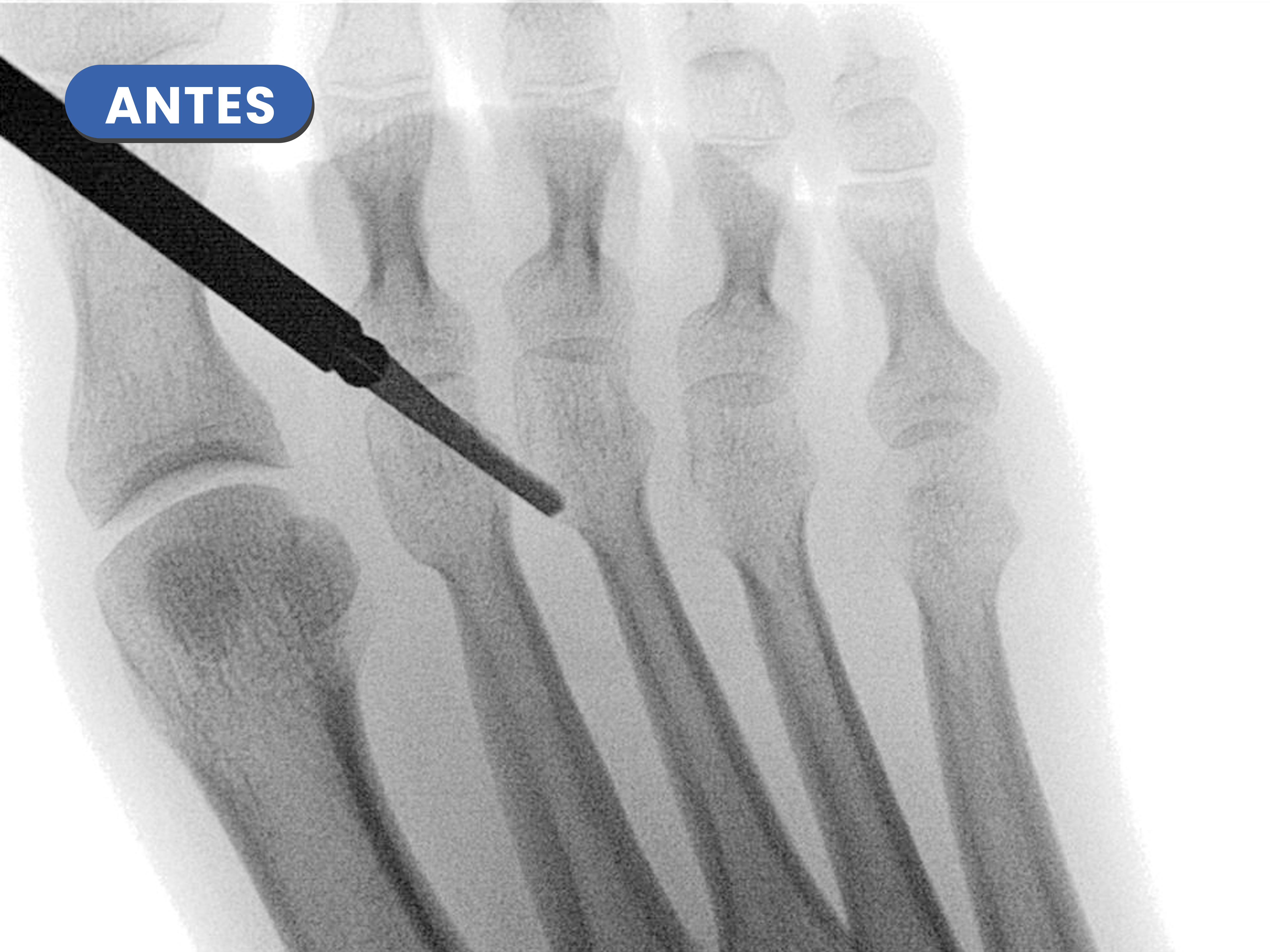 En este caso realizamos una osteotomía acortadora del tercer metatarsiano al ser más largo estaba creando una sobrecarga en la zona, se puede visualizar como disminuye de tamaño en la imagen de después de la cirugía.